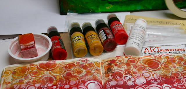 For this project I chose the ARTplorations Retro Circles stencil, which I taped down so it wouldn't move (painter's masking tape is great for this because it comes off the page so easily.) Designer Tip #1: Using only one stencil but lots of different colors will give your piece great energy without being too busy.